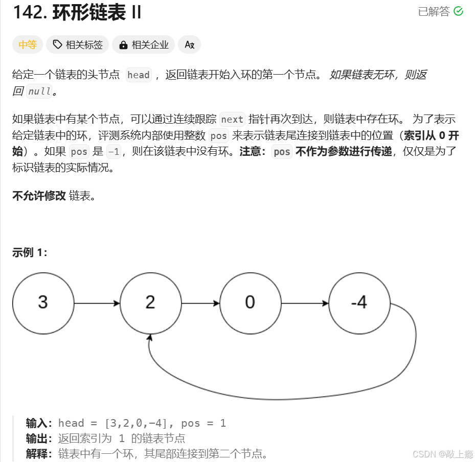 方法一:快慢指针。该题可以用一个快慢指针同时从链表头开始走,如果快指针走到空节点还未与慢指针相遇,则该链表无环。如果快指针与慢指针相遇,则有环并记录相遇点,找两个速度相同的指针一个从头开始走,一个从相遇点开始走,那么它们相遇时的点就为环的入口点。这个算法比较难以想到,而且一眼难以看出它的正确性需要有严谨的证明。我在以下文章中有详细讲解:链表经典面试题-CSDN博客
