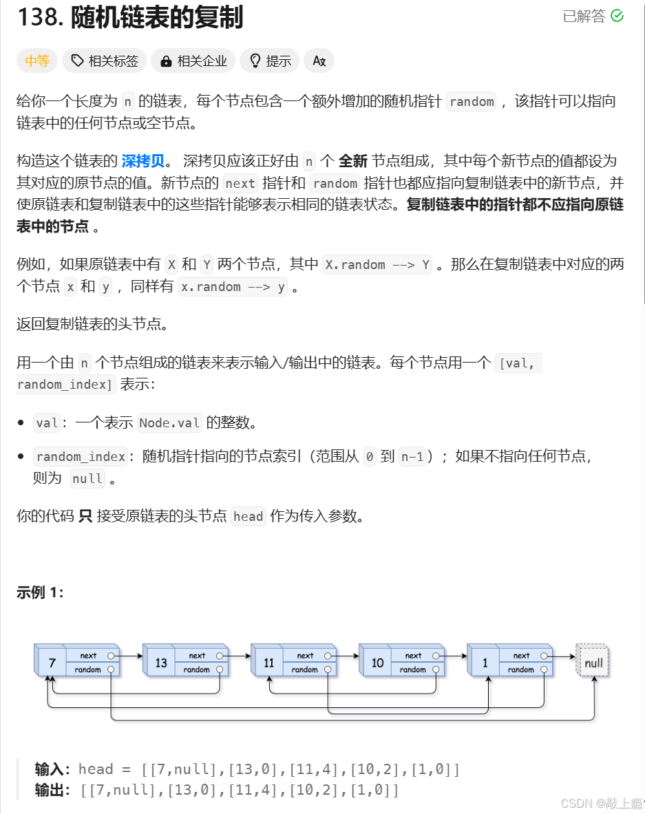 该题是对一个随机链表进行深拷贝,给一个链表要求原模原样拷贝一份,而这个题的难点并不在于拷贝节点本身,而是在于拷贝节点后random指向的节点是什么。尽管我们知道原链表的random指向什么但很难根据旧空间random的指向来判断新空间random的指向。不过因为旧空间与新空间有一个一一映射关系,所以我们可以使用一个map,key储存旧空间的值,value储存新空间的值。这个时候就非常好办只需旧空间的random找到指向的key就能找到新空间random应该指向的value。