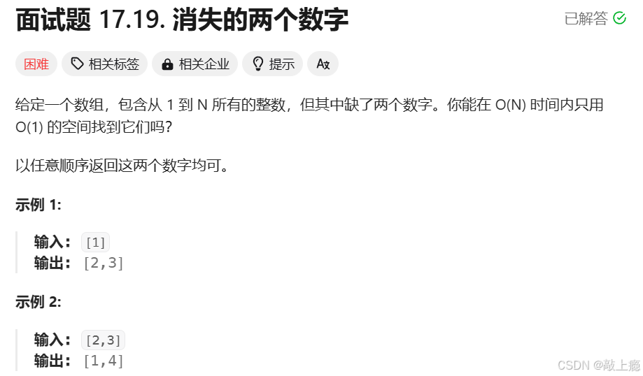 };面试题 17.19. 消失的两个数字 - 力扣(LeetCode)