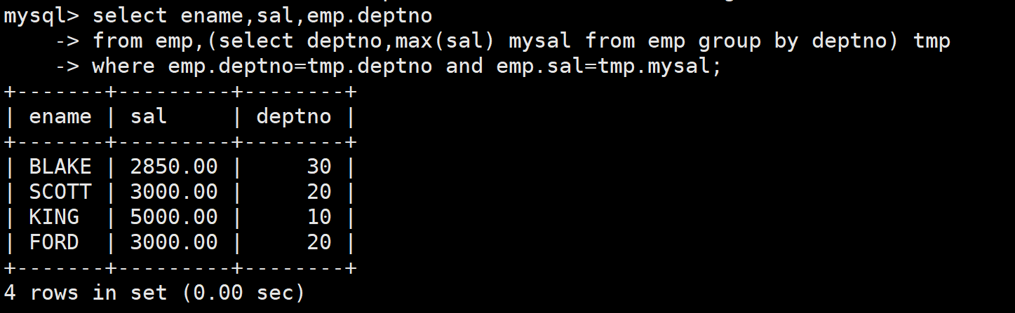 from emp,(select deptno,max(sal) mysal from emp group by deptno) tmp