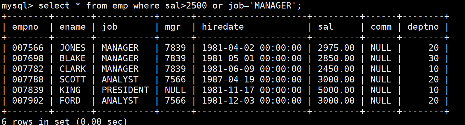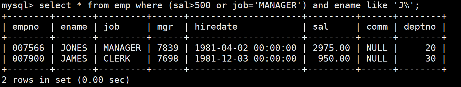 select * from emp where (sal>500 or job='MANAGER') and ename like 'J%';或:
