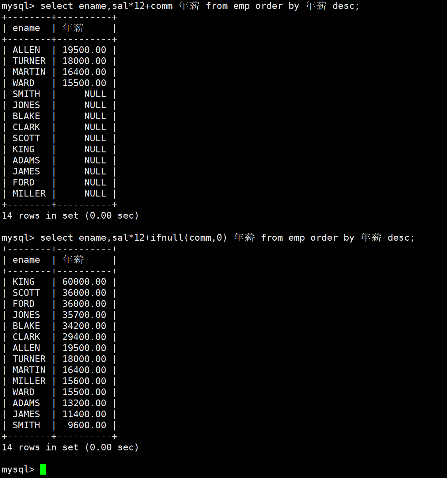 select ename,sal*12+ifnull(comm,0) 年薪 from emp order by 年薪 desc;注意:null不参与运算