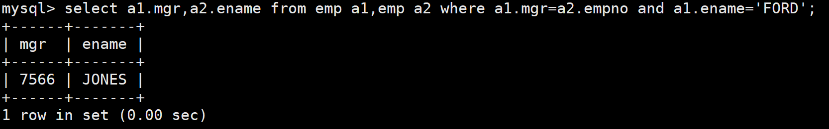 select mgr,ename from emp where empno=(select mgr from emp where ename='FORD');方法二:自连接
