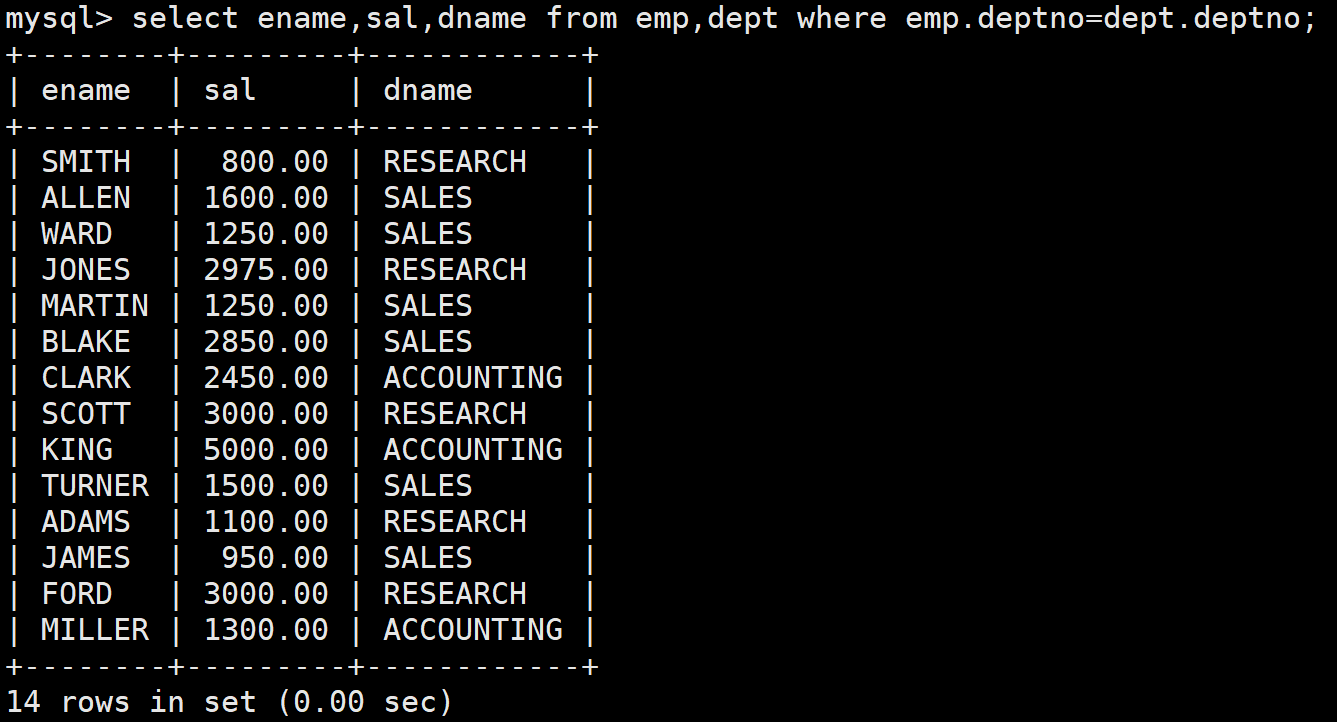 select ename,sal,dname from emp,dept where emp.deptno=dept.deptno;雇员名、雇员工资和部门名字分别在两张表中,所以直接整合: