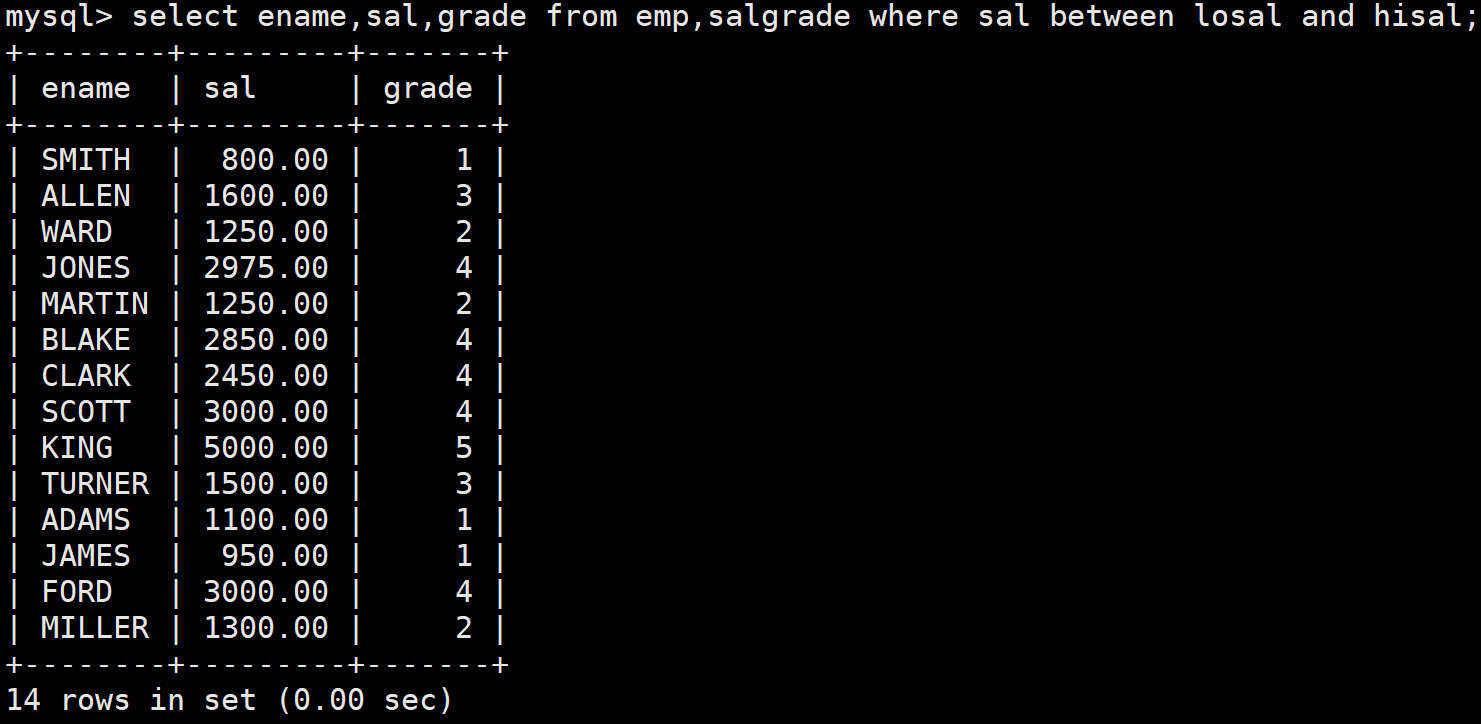 select ename,sal,grade from emp,salgrade where sal between losal and hisal;