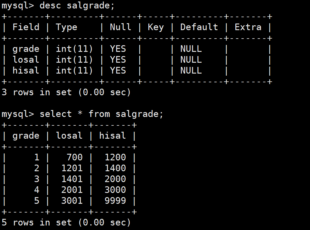 select ename,sal,grade from emp,salgrade where sal>=losal and sal<=hisal;或: