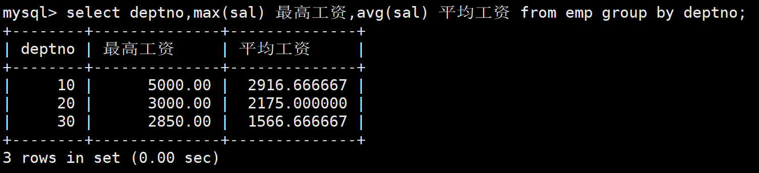 select deptno,max(sal) 最高工资,avg(sal) 平均工资 from emp group by deptno;