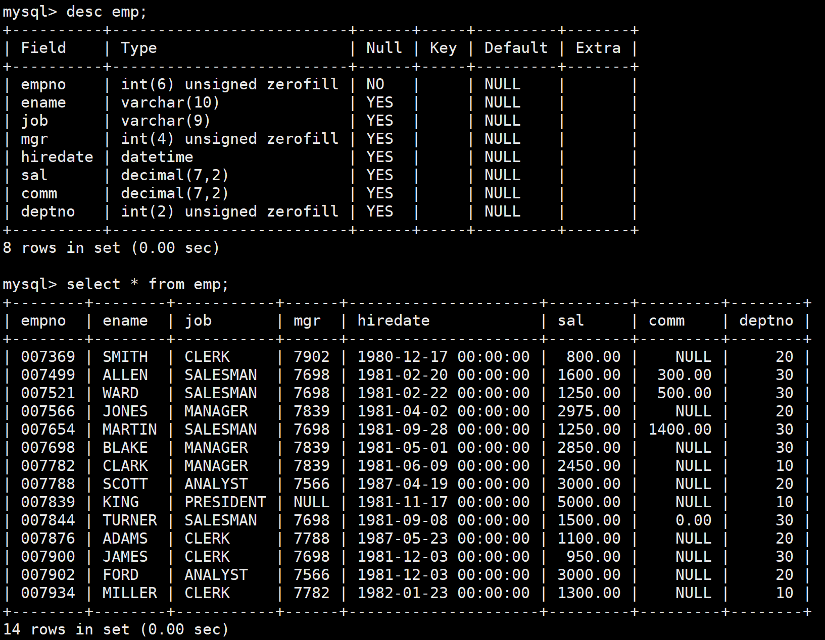 首先准备这样三张表 雇员信息表、部门信息、薪水等级。如下: