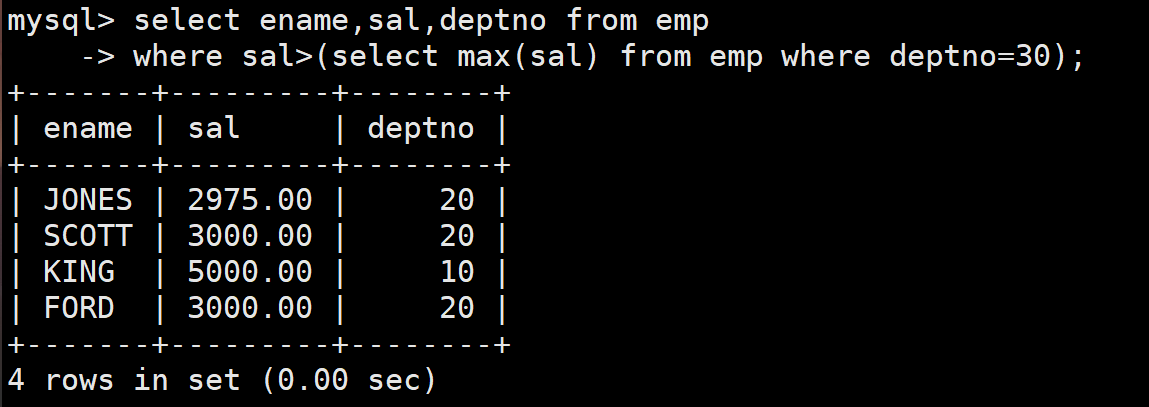 where sal>any(select sal from emp where deptno=30);查询和SMITH的部门和岗位完全相同的所有雇员,不含SMITH本人。