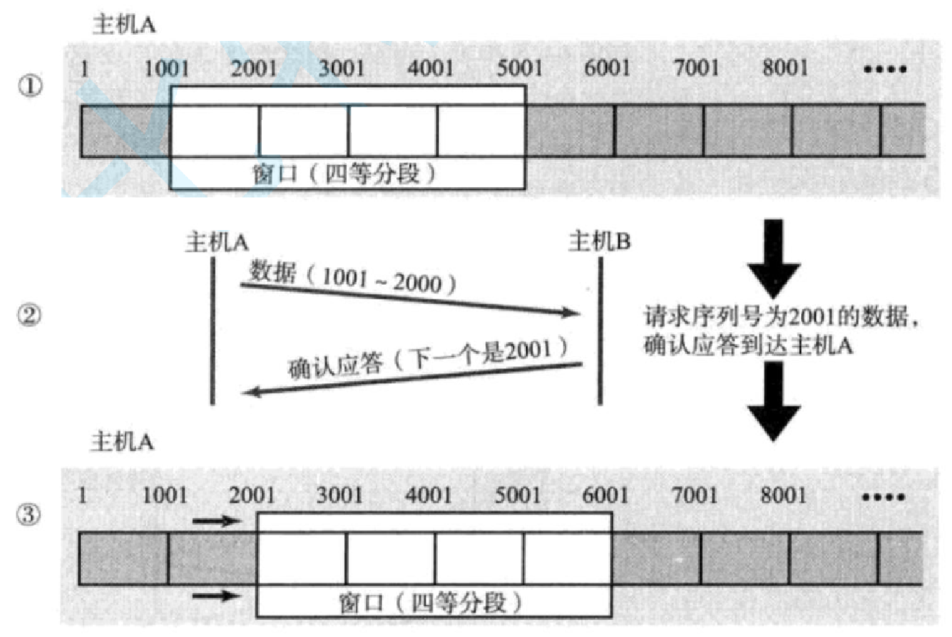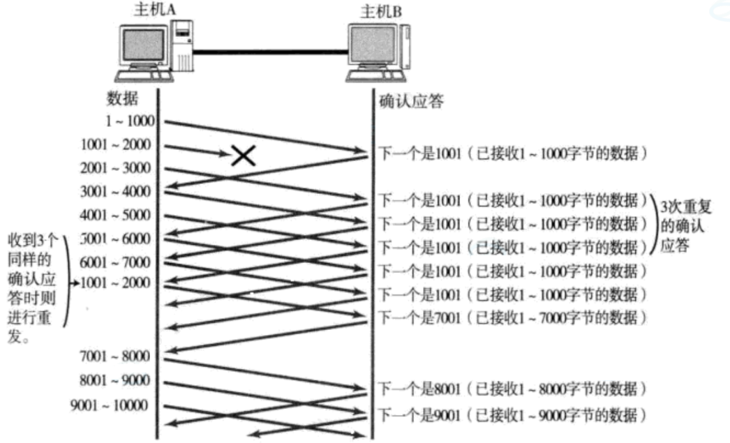 A主机收到应答1001唯一能确定的是1000及以前报文对端已经收到了,而连续收到3个1001应答,说明1001~2000丢了,进行快重传。中间部分丢没丢不清楚,先不管,在后续会有条件触发。