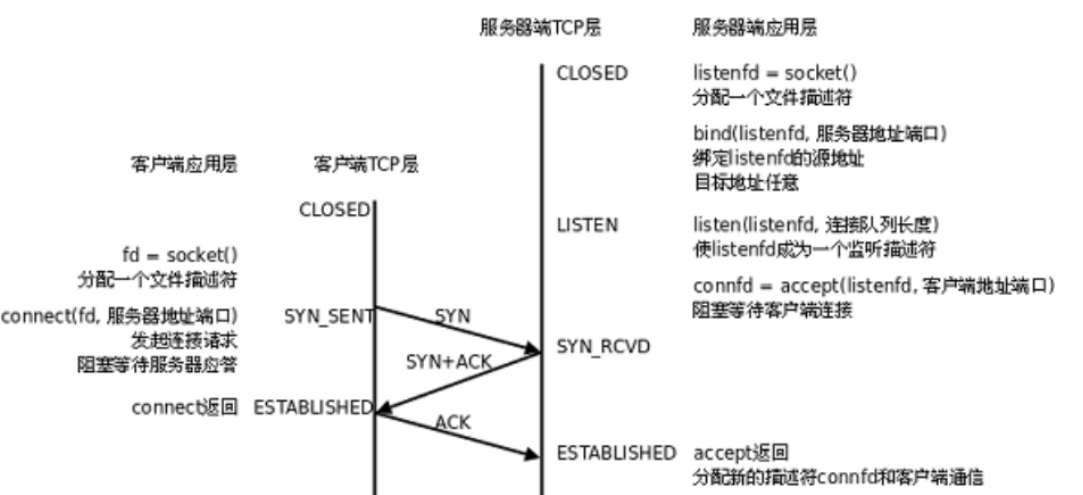 服务器listen监听,客户端connect发起三次握手(注意措辞)。三次握手具体过程是由客户端和服务器操作系统自动完成。