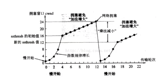 到后面突然网络拥塞(即大量丢包),即探测出拥塞窗口。ssthresh参数变成此时拥塞窗口的一半,所有主机此时数据传输量从头(从0)慢增长开始。