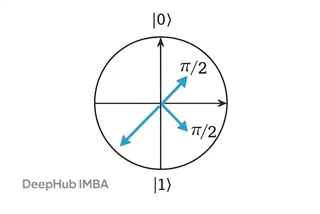 旋转角度直接控制量子比特在Bloch球面上的位置。角度0保持量子比特在 |0⟩ 状态,π/2 创建等权叠加 (|0⟩ + |1⟩)/√2,π 翻转到 |1⟩ 状态。这种几何解释让角度编码很好理解——每个特征实际上在旋转对应的量子比特,把信息编码在量子态的几何结构里。