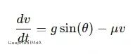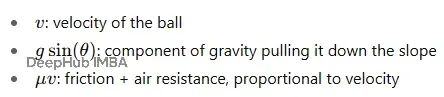 这个方程抓住了两个关键力量:重力让球加速、摩擦让球减速,速度的变化取决于这两个力的平衡。从数学上看,这个简单的方程能完整地描述球从静止到终端速度的整个过程。