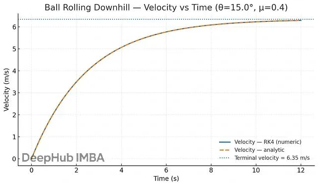 另一个例子是球滚下山坡。球刚开始几乎不动,但重力会让它加速。滚得越快摩擦阻力越大,最终速度会趋于稳定。整个过程可以用一个ODE来描述: