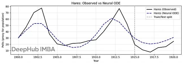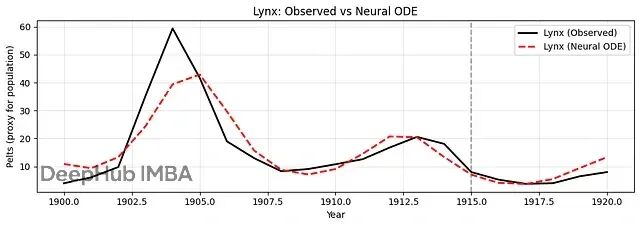 结果显示Neural ODE成功捕捉了捕食者-猎物系统的周期性动力学。模型学会了兔子和猞猁种群的相互依赖关系,能够产生平滑的预测轨迹。