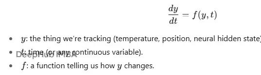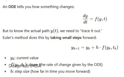 比如说ResNet的每一层都在做同样事:取当前隐藏状态,加上一些变换,然后传递给下一层。这和数值求解ODE的欧拉方法非常相似——通过小步长逼近连续变化。