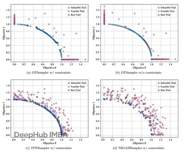 Optuna v4.5的GPSampler约束多目标优化功能确实是个不错的更新。C2-DTLZ2基准测试证明了几点:减少了不可行区域的无效评估,可行超体积收敛比TPESampler和NSGAIISampler都快。