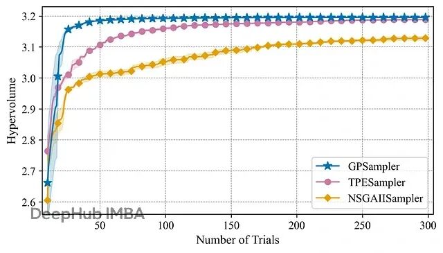 GPSampler的超体积增长曲线很有意思。不到50次试验就达到了TPESampler的最终水平,比NSGAIISampler领先得更多。这种快速收敛对计算成本高的优化问题特别重要——减少函数评估次数就是直接节省时间。