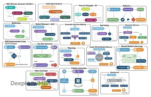 主要就这么几类:多智能体系统让不同角色分工协作;集成决策让多个智能体投票选最优解;思维树(ToT)探索多条推理路径再择优;反思式架构能自我审视和改进;ReAct循环在思考与行动间迭代。