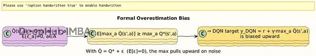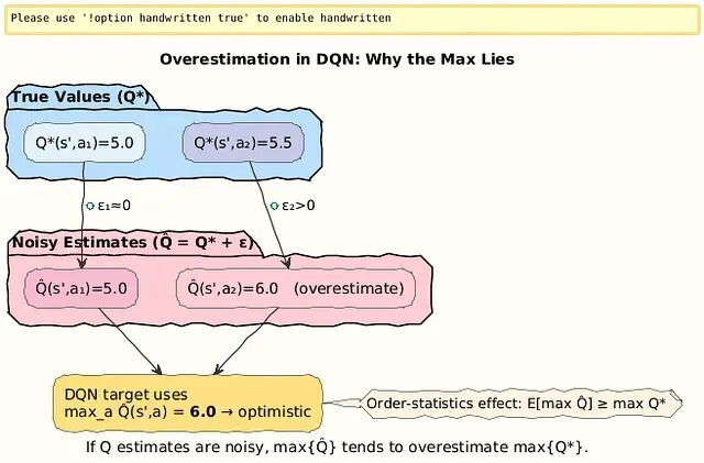 DQN的过估计源于max操作符偏好噪声中的高值。Double DQN把动作选择(在线网络θ)和价值评估(目标网络θ^−)分开处理,让目标值更接近真实情况,稳定性和性能都得到改善。前面两个数值例子清楚展示了偏差是如何被消除的。