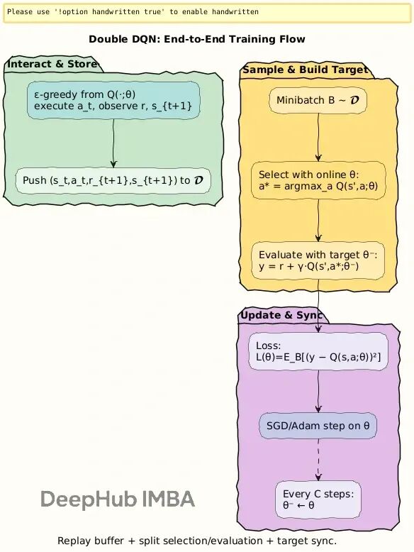 每个episode里循环执行:用ε-greedy策略从在线网络选动作,执行后观察奖励r和新状态s′,把这条经验存进池子。然后从池里随机采样一批数据,用DDQN规则算目标值,对下面这个损失做梯度下降: