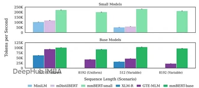 mmBERT模型比以往的多语言编码器模型快得多、效率也高得多。base版本在可变序列上快了2倍多,长上下文快了约4倍。small版本大概是base的2倍速度,也比其他同规模多语言模型快2倍。