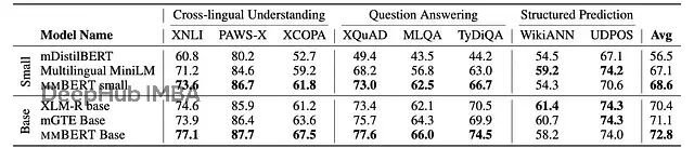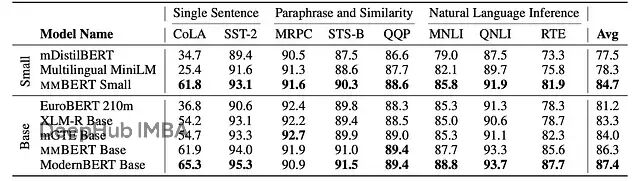 mmBERT small在英语GLUE上的成绩相当亮眼,平均84.7分,远超MiniLM的78.3,甚至比之前一些base规模的模型还强。mmBERT base虽然训练数据以非英语为主,英语性能还是逼近了ModernBERT(86.3 vs 87.4)。
