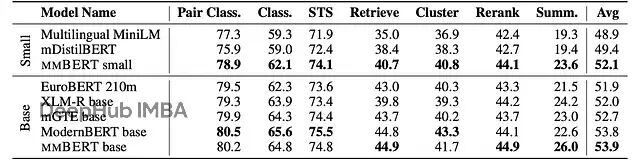 MTEB v2英语检索测试中,mmBERT模型展现出不小的优势。small版本超过了mGTE和XLM-R,base版本平均53.9分,比mGTE(52.7)高,跟ModernBERT(53.8)基本持平。