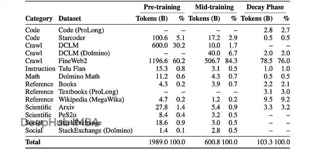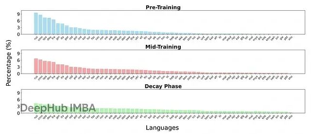 非英语部分主要来自FineWeb2,以及它的高质量过滤版本FineWeb2-HQ(覆盖20种语言)。多语言维基百科用的是MegaWika v2,包含60种语言,并且都经过了筛选。英文语料还补充了好几个精选数据集:Dolma里抽取了StarCoder、Stackexchange、Arxiv和PeS2o;Dolmino贡献了数学、筛选过的Stackexchange、Tulu Flan指令数据和书籍;ProLong则提供了代码仓库和教材。