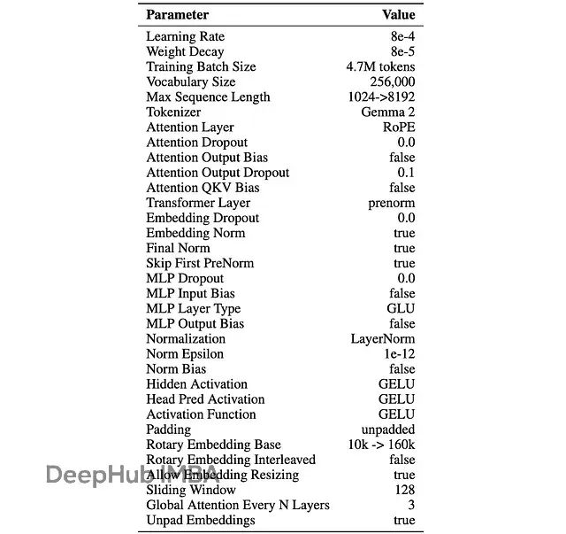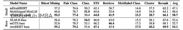 整体架构和ModernBERT保持一致,但换成了Gemma 2的tokenizer来处理多语言输入。base和small两个版本都用了22层网络,中间维度是1152(这点和ModernBERT-base一样),区别在隐藏层维度上:base是768,small则缩减到384。