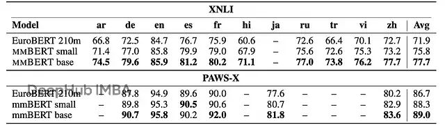 即便在EuroBERT的优势语言上,mmBERT base和small在XNLI和PAWS-X上仍然占优。举个例子,阿拉伯语XNLI上mmBERT base得分74.5 F1,EuroBERT只有66.8 F1。