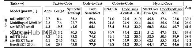 CoIR基准测试中,mmBERT base平均42.2分,远超XLM-R(33.6)这类大规模多语言模型。不过没跑过EuroBERT-210m(45.3),估计是因为EuroBERT用了更高质量的非公开训练数据。