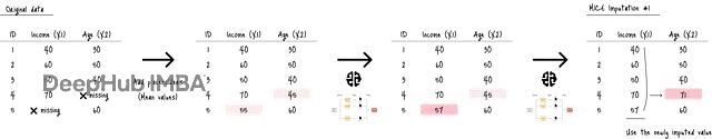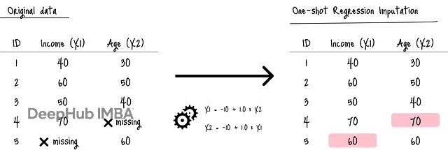 它先用均值之类的粗略值填充所有空缺(浅粉色),然后用包括这些初值在内的"完整"数据去改进插补(深粉色)。这个过程会重复多轮,直到插补值趋于稳定,或者说就是收敛了。