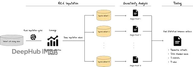 MICE首先运行多轮插补循环,用预测模型生成目标变量的后验分布。接着从这个分布中反复抽样(比如M次),生成多个版本的完整数据集。每个数据集的插补值都不相同,这种变异性是MICE的核心价值所在。