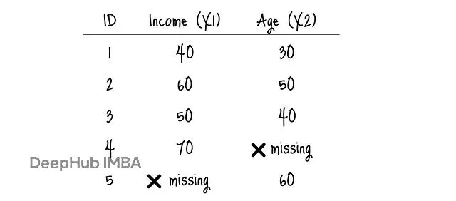 MICE的关键在于"链式"二字。假设有个简单数据集,包含Income(X1)和Age(X2)两个特征,都存在缺失。