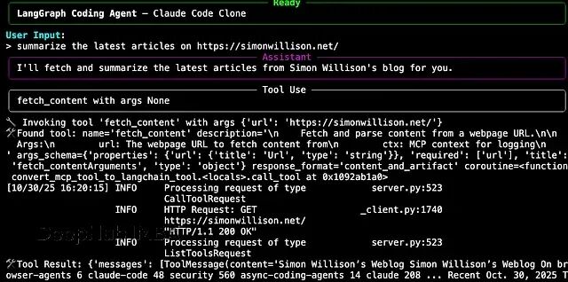 )代理同时加载本地工具(比如单元测试)和运行在 Docker 容器里的 MCP 工具。工具设计上返回结构化的 ToolMessages,让 StateGraph 能够正确路由响应回模型。这些工具支持运行 Python 代码、搜索 DuckDuckGo、与 GitHub 交互等操作。状态在交互间通过 SQLite 检查点机制保持。