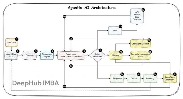 Agentic AI系统能独立规划任务、执行多步骤操作、调用各种工具,并根据结果动态调整策略,远不止聊天机器人那么简单。核心能力包括:LLM推理、工具使用(API、数据库、代码执行)、记忆系统、决策循环。