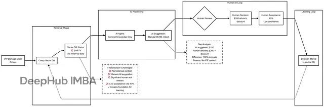 每个人类决策都存进向量数据库(Pinecone、Weaviate、Qdrant、PgVector、Milvus等等),记录包括:上下文(客户类型、具体情况)、AI原始建议、人类最终决策、修改理由、执行结果。