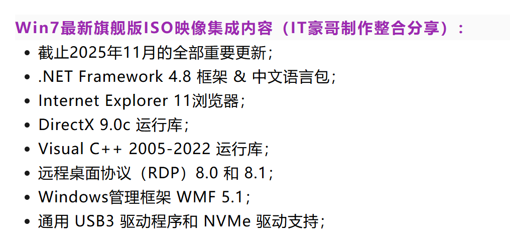 🔶提供集成补丁的最新Win7 SP1旗舰版ISO映像,IT豪哥制作整合分享,旗舰版功能最全,系统完整纯净无精简,仅集成了一些实用的微软运行库/框架等,以及USB3和NVMe驱动,方便在更多设备安装。(安装后建议关闭系统更新,避免获取到不必要的补丁)