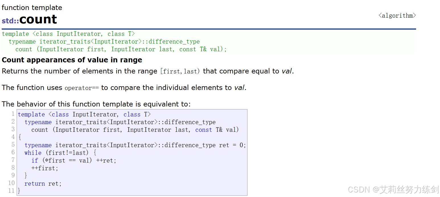 count函数的功能:指定值在迭代器范围内的出现次数。