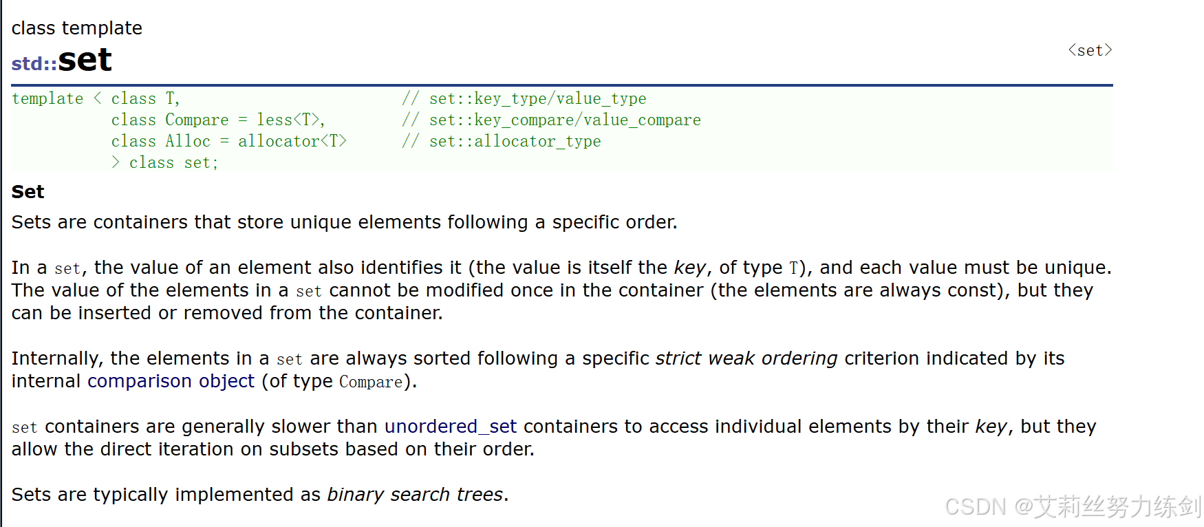 2、set对T要求比较大小,默认要求T支持小于比较的就可以了,如果不支持或者想按自己的需求走可以自行实现仿函数传给第二个模版参数;