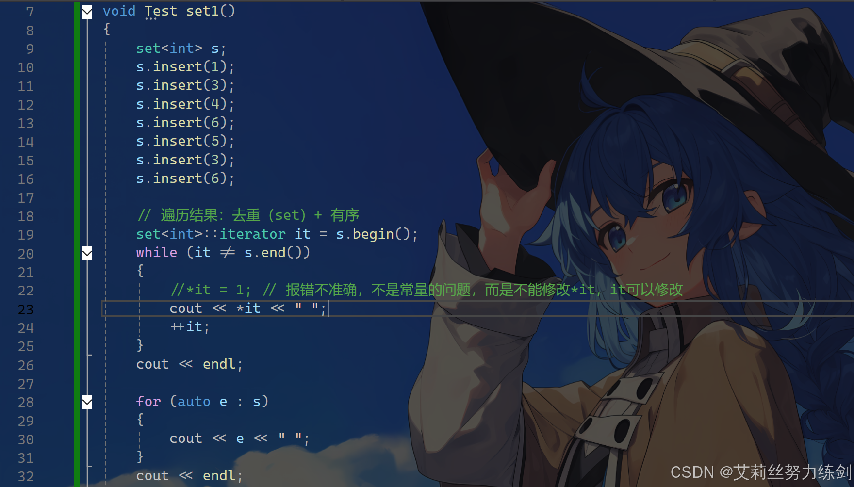 set的支持正向和反向迭代遍历(至少是双向迭代器),遍历默认按升序顺序,因为底层是二叉搜索树,迭代器遍历走的中序;支持迭代器就意味着支持范围for,set的iterator和const_iterator都不支持迭代器修改数据,修改关键字数据,会破坏底层搜索树的结构。