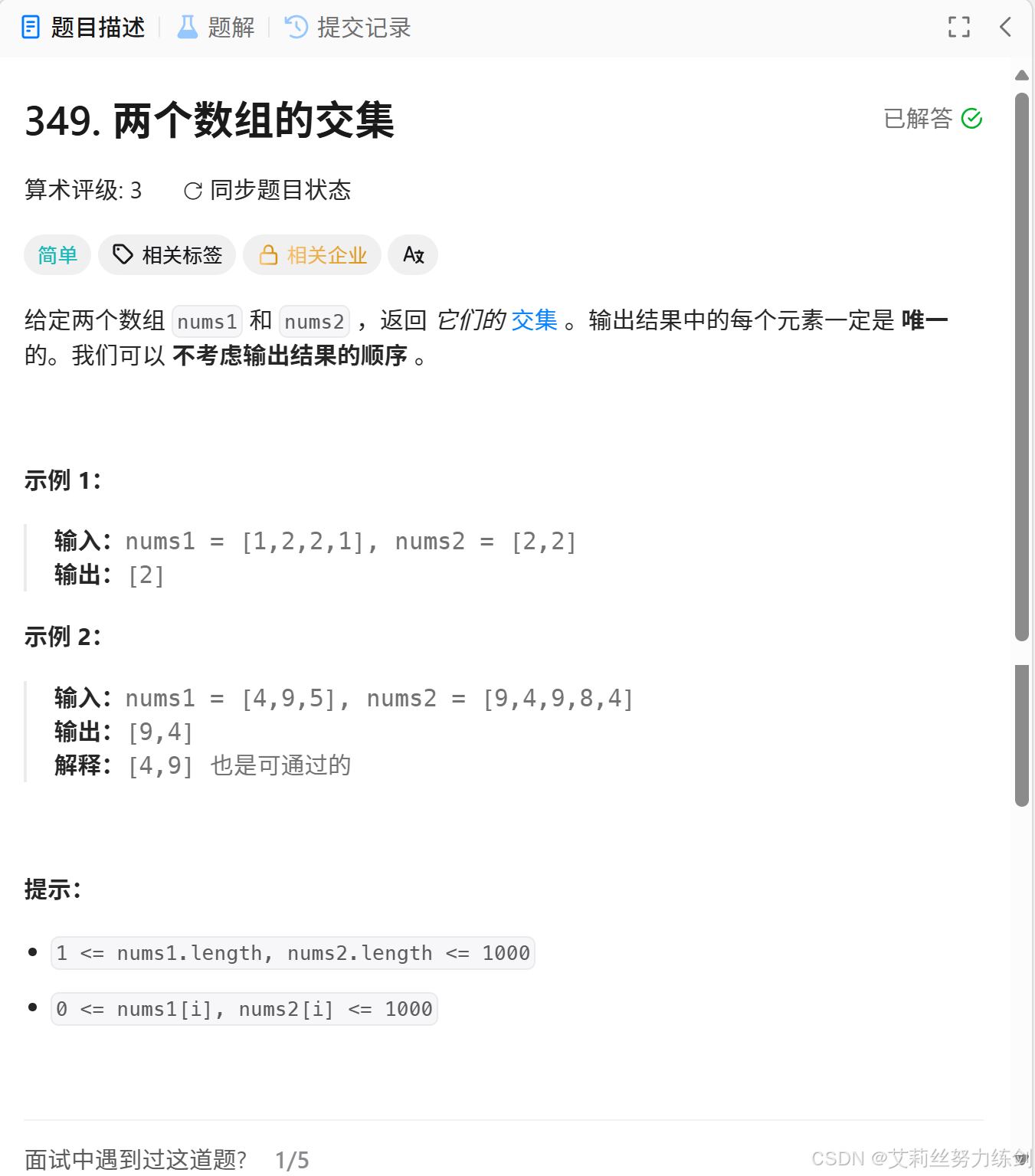 力扣题解链接:使用哈希数组解决【两个数组的交集的问题】