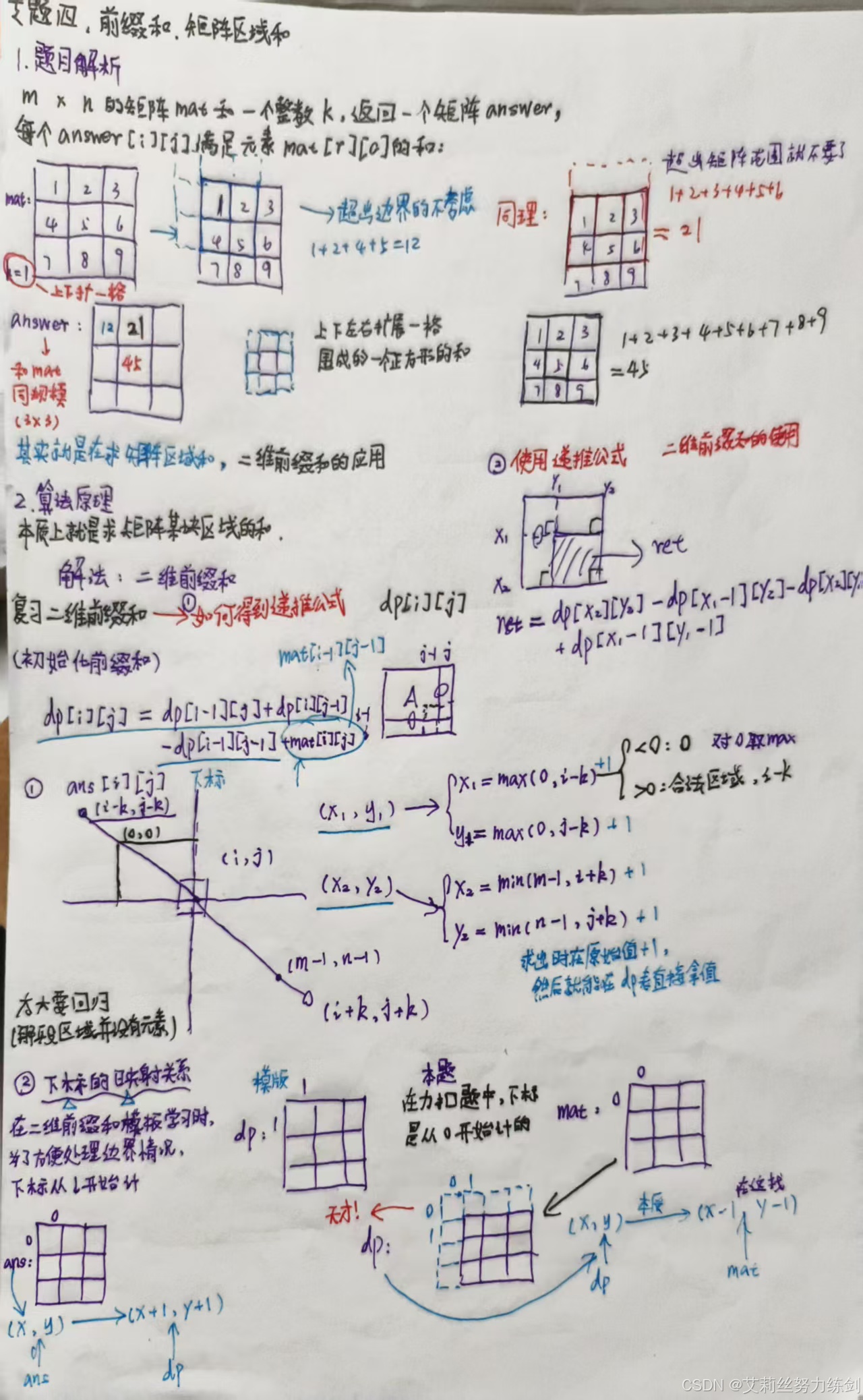 二维前缀和的简单应用题,关键就是我们在填写结果矩阵的时候,要找到原矩阵对应区域的【左上 角】以及【右下角】的坐标(这里艾莉丝推荐uu们画图,一目了然)——