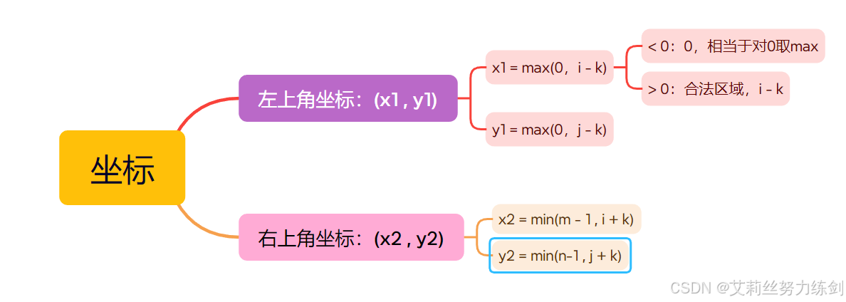 (1)左上角坐标:x1 = i - k,y1 = j - k,但是由于会「超过矩阵」的范围,因此需要对0取一个max。因此修正后的坐标为:x1 = max(0,i - k),y1 = max(0,j - k); (2)右下角坐标:x1 = i + k,y1 = j + k,但是由于会【超过矩阵】的范围,因此需要对m - 1,以及n - 1取一个min。因此修正后的坐标为:x2 = min(m - 1 , i + k),y2 = min(n - 1 , j + k)。