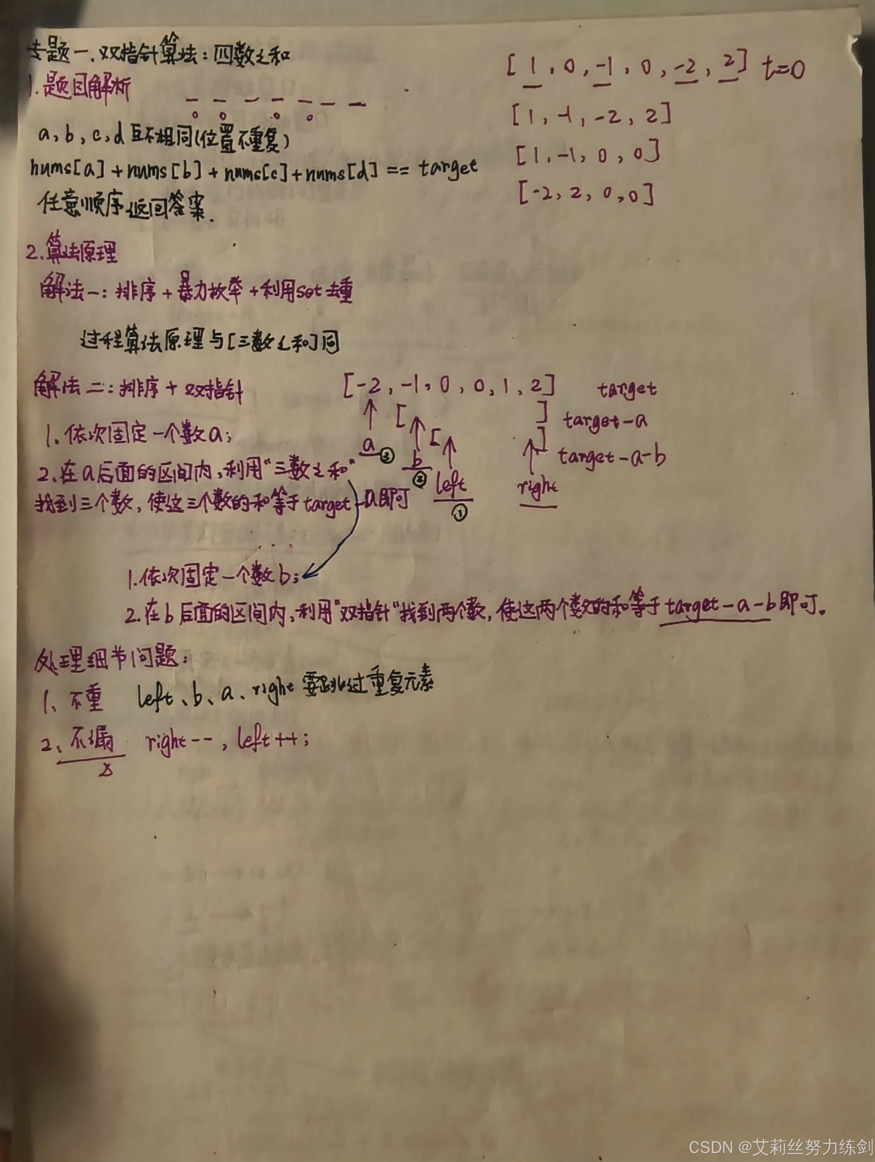 1、找到一个结果之后,left和[right指针要【跳过重复】的元素; 2、当使用完一次双指针算法之后,固定的a也要【跳过重复】的元素。