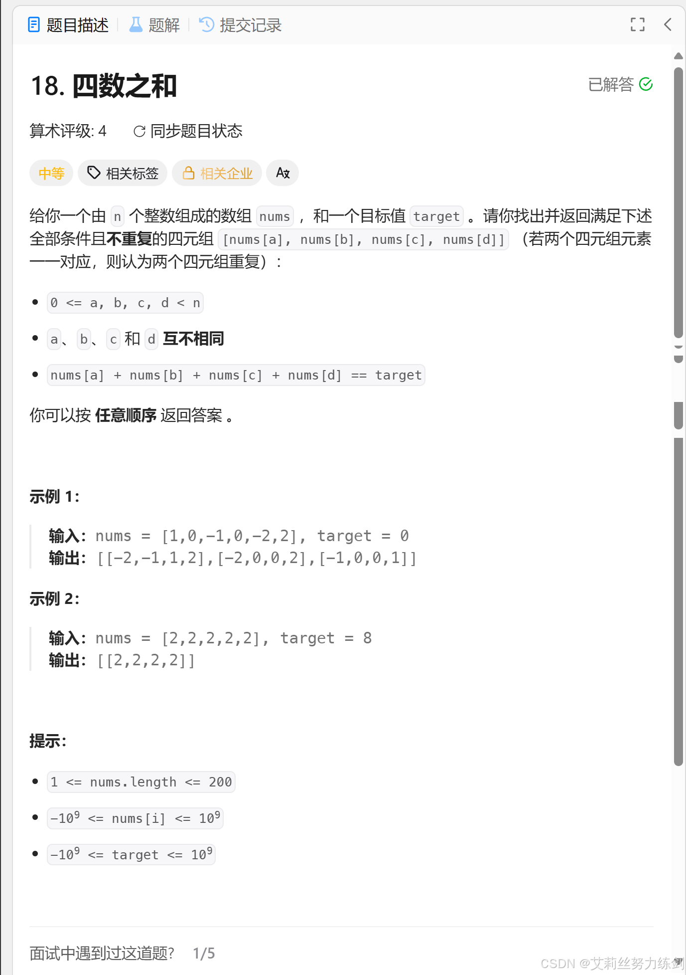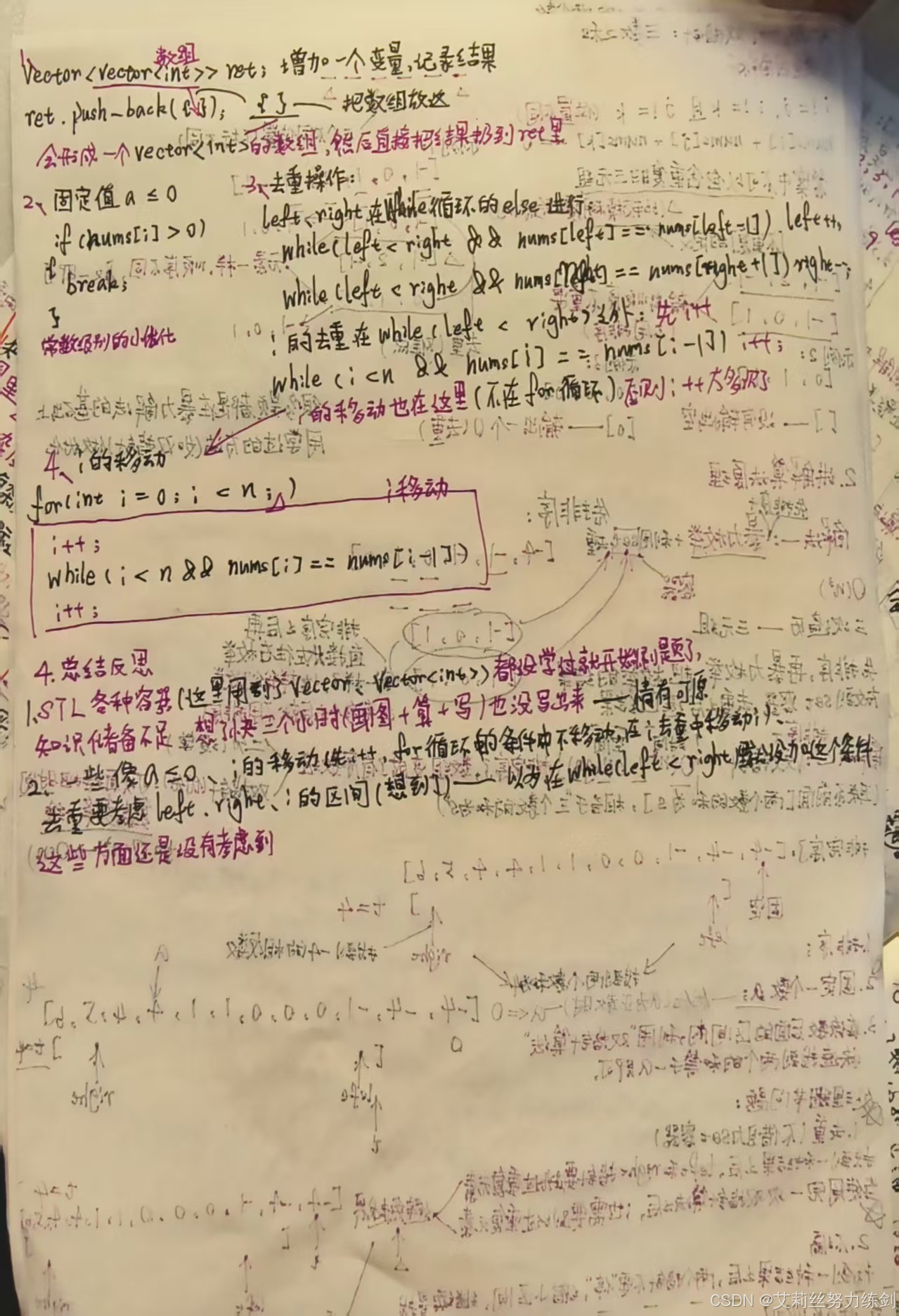 总结: 1、没学到STL,vector<vector<int>> ret;和ret.push_back({nums[i],nums[left],nums[right]});这步根本想不到,直接来刷题了,对自己的实力没有清晰的认知(QAQ); 2、没想到固定的值a <= 0,这个常数级别的小优化想不到; 3、还是去重操作,都在一个条件判断下去重了,left和right在while(left < right)里面去重,i应该在它外面去重,因为刚才我已经让for循环的i++(i移动)这个操作搬到for里面来进行了,这样去重了,这样移动完之后,得到的i就是下一步我要固定的那个数了; 4、i移动的操作在while循环里面搞定,for循环for(int i = 0;i < n;)这个可以空着不写没有想到; 5、时间复杂度:O(n^2),for循环嵌套一个while循环; 6、空间复杂度:无限接近于O(logn)——只是在排序那里稍微占了点空间,压栈会占用logn的空间,其他都是只用了有限个变量。