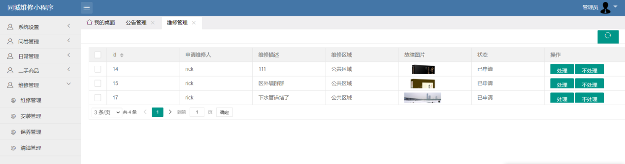 管理员可进行维修管理、安装管理、保养管理以及清洁管理。