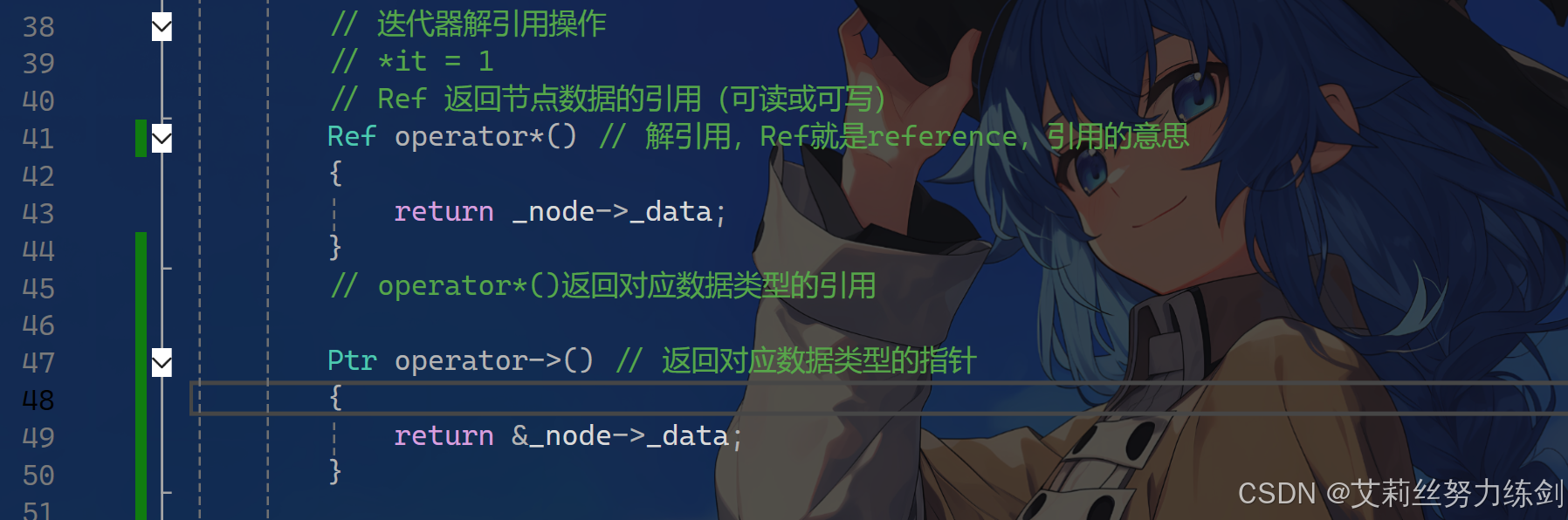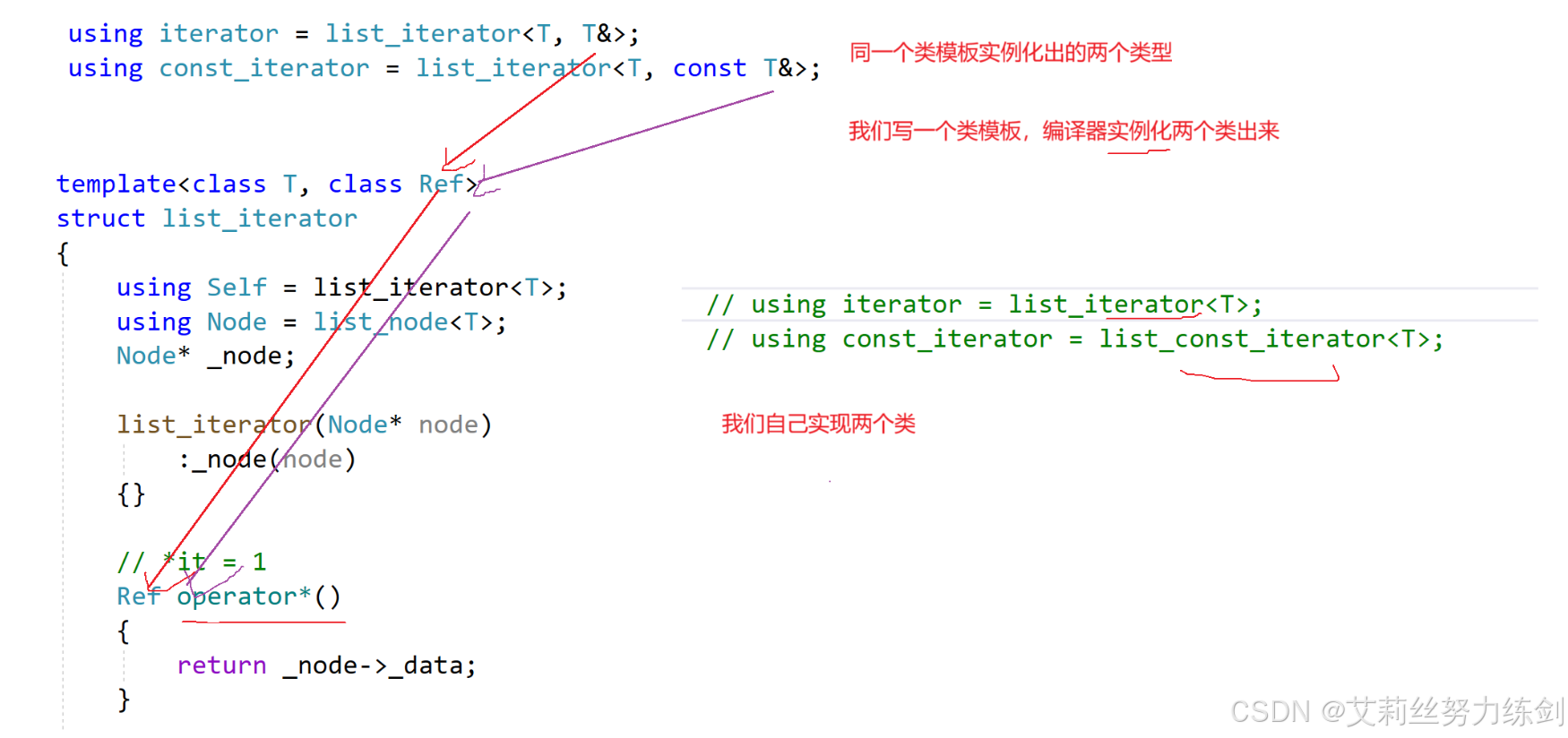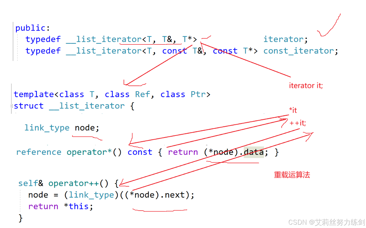 // 迭代器还有一种重载,因为迭代器要模拟指针的行为,指针有两种解引用的方式,一种是“*”,一种是“->”